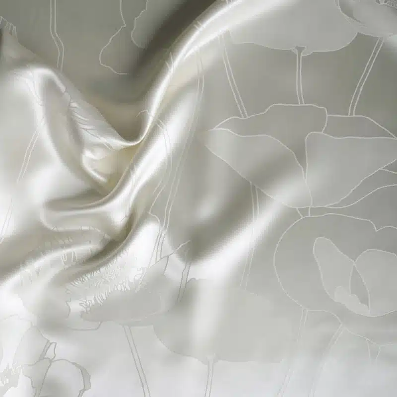 Poppy blossoms, larger than in nature, woven into the fabric rather than printed. Adele works exclusively with natural tones—the pattern is created solely by the interplay of matte and sheen in the silk weave. Jacquard weaving makes it possible: where the weft thread lies on top, the surface shimmers; where the warp dominates, it remains matte. A play of light, not a play of colour. Modern in feel, classic in execution.