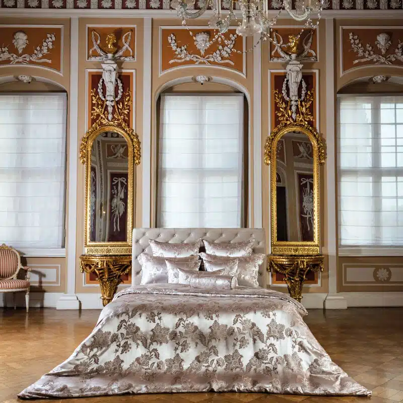 Silk has been woven in Plauen, Saxony, since the days of the German Empire. The Plauen silk mill is one of the last fully integrated manufactories in Europe—and the last to truly master weaving silk in Jacquard patterns. Floral ornaments, paisley designs, baroque textures: what is created here is woven, not printed. The difference lies in the depth. Woven patterns live with the light; they change, they have substance. Nearly a century of experience goes into every piece—knowledge passed from hand to hand and preserved within the weave itself. When you touch Seidenweber bedding, you touch that history.