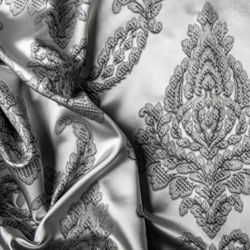 Renaissance ornamentation on a light ground, woven so the motifs appear appliquéd—though everything is in one piece. Aviano shows what jacquard weaving can do: damask effects in pure silk, rich in contrast through the interplay of black weft and light warp. The design demands absolute precision; any flaw would be visible. In Plauen, this craft has been mastered for almost a century.