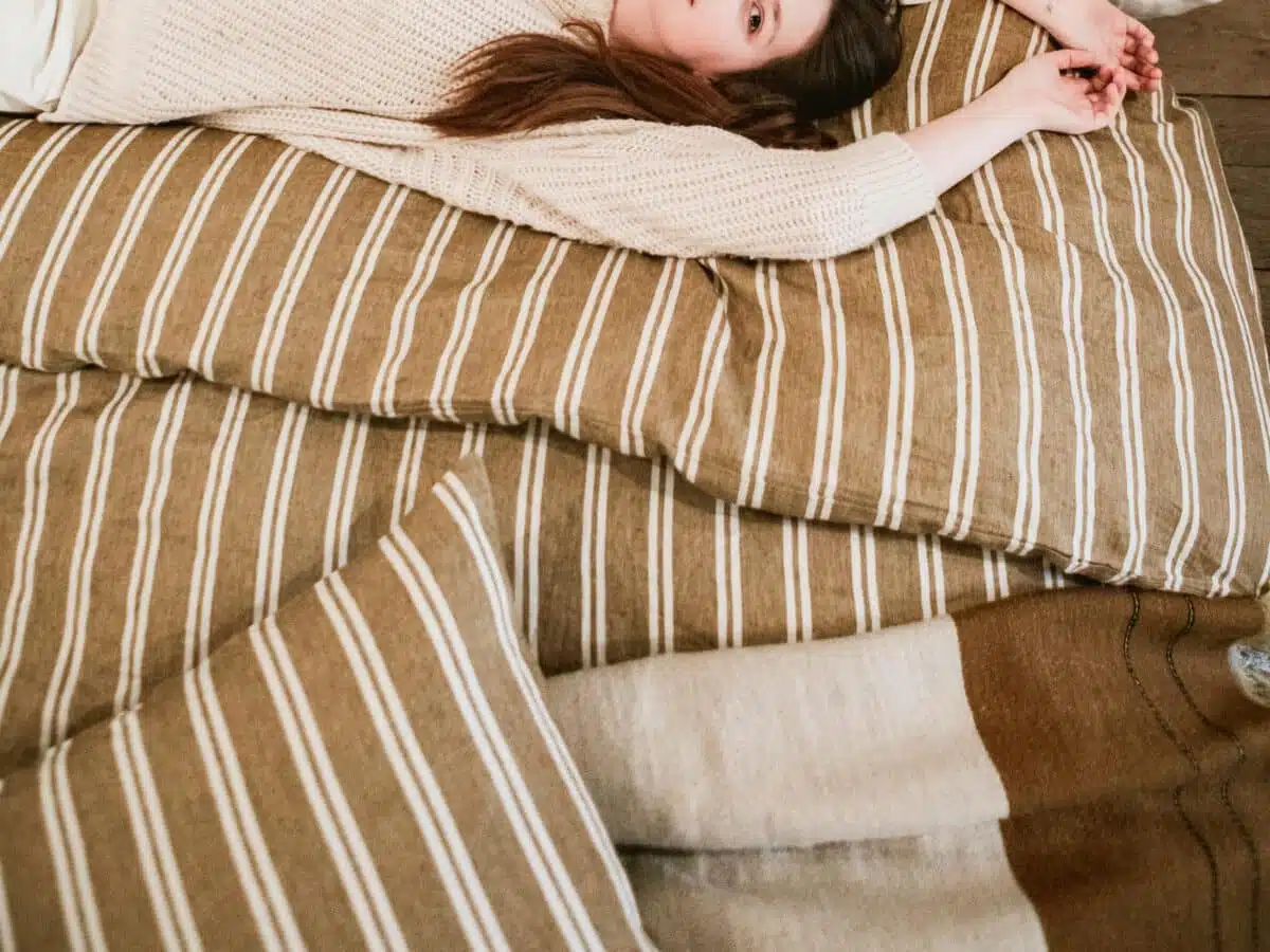 What the designer says: “The natural pigments range from green and gold to brown and red. Just like linen colors, they are absolutely unique. Countless pictures of these warm shades were the inspiration for this collection – Uncommon Ground. The rich, bold colors, combined with natural fibers such as flax/linen and wool, resulted in a particularly colorful, vibrant collection. The Bed & Breakfast in Bruges where we took the photos seemed made for it. Our beautiful model Marie was supported by the dog of the house: Pickles! Our favorite bed linen is now available in a new design. The bronze and bone striped fabric is made of medium-weight, tightly woven twill. Simply striking!”