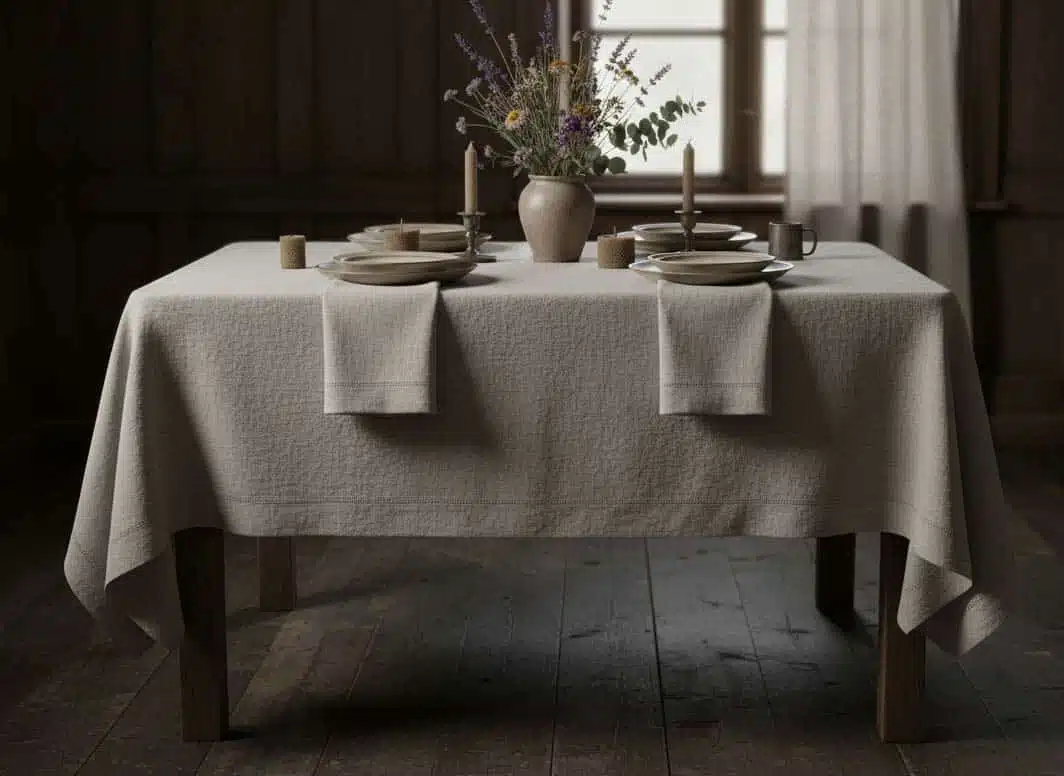 Linen for the table is a material with a long tradition in the temperate climate zones of Europe. The linen fiber, obtained from Western European flax cultivation, is characterized by its smooth, closed surface, which initially repels liquids. This protection makes it possible to react to spills before a stain forms. At the same time, linen is highly absorbent as soon as the fiber is soaked – a property that makes napkins functional. The natural smoothness creates the cool, firm feel that gives tablecloths their characteristic drape. Linen is naturally antistatic and bacteriostatic – properties that make it particularly suitable for contact with food. The fiber does not weaken with use, but becomes more supple. Linen develops patina instead of wear. Tablecloths made from European organic linen become softer over time without losing their structural strength. The GOTS certificate guarantees that no chemical bleaching agents or synthetic pesticides are used from cultivation to finishing.