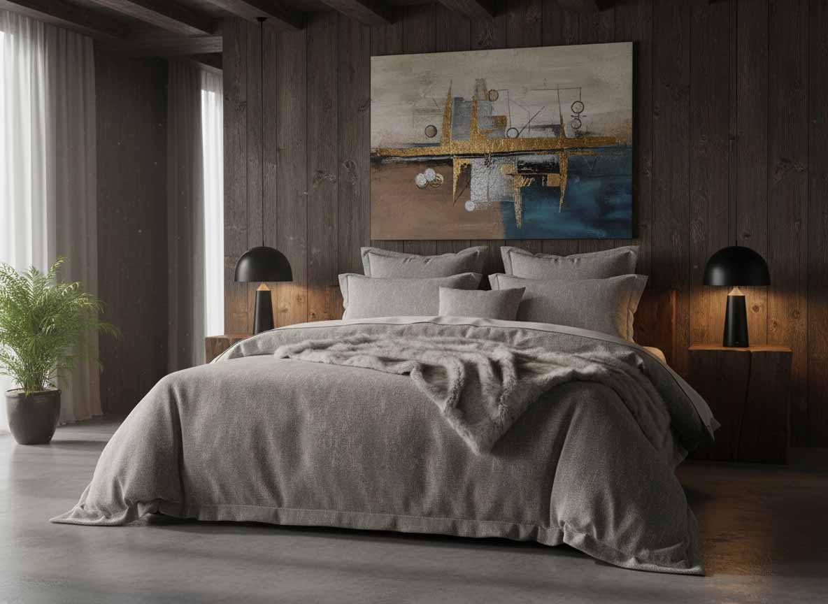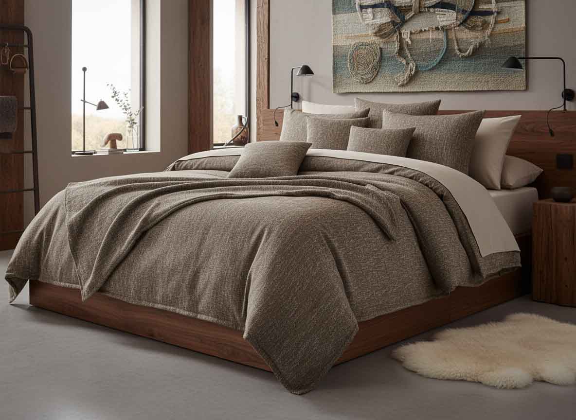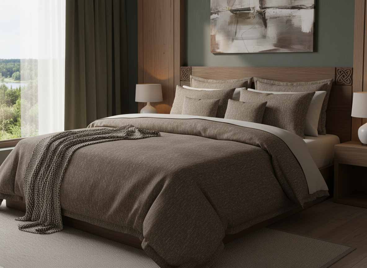 Haithabu – a name that leads into the depths of Nordic history, to the roots of European trading culture in the early Middle Ages. Located on the Schlei, Haithabu was one of the most important trading towns in Northern Europe between the 8th and 11th centuries, a melting pot of cultures. This design bears the spirit of that time: clear lines instead of lavish ornamentation, geometric austerity instead of baroque opulence, powerful simplicity instead of courtly splendor. The patterning is reminiscent of early medieval weaving, of braided bands and runic symbols, of the functional aesthetics of Nordic textile traditions. Here, Scandinavian restraint and archaic power merge to create a design of timeless clarity. The colors reflect the raw beauty of Scandinavian landscapes. Haithabu transforms your bedroom into a place of Nordic serenity, where simplicity becomes the highest form of elegance.