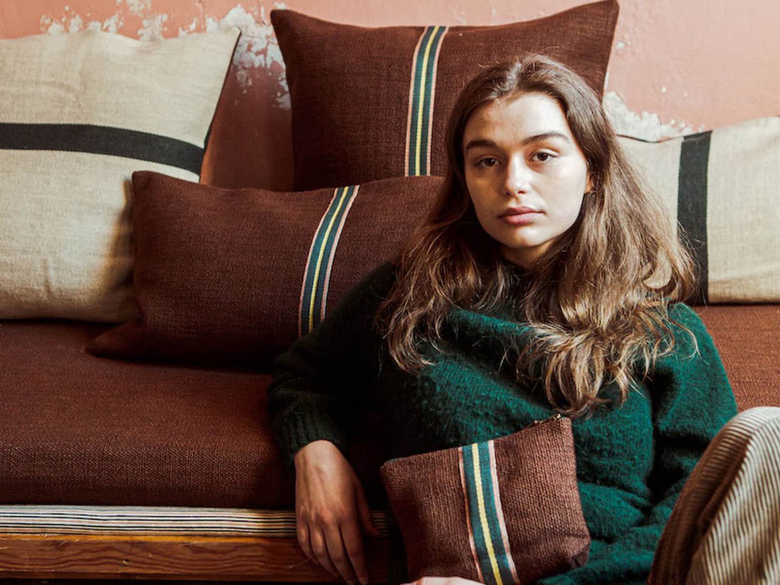 The Jasper Leather Linen-Wool Mix in Forest Colours by Libeco. Inspired by the colours deep in the forests of the Ardennes. Here in the rich Leather shade. The new linen-wool mix is available as cushion cover and rug or bag in four rich, warm colours. All items are finished with a linen trim. They offer endless possibilities for combination and pair beautifully with almost all Libeco collections.