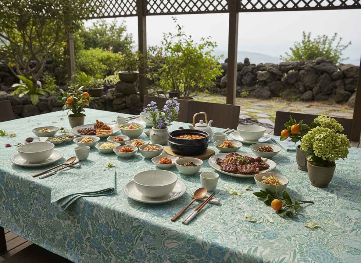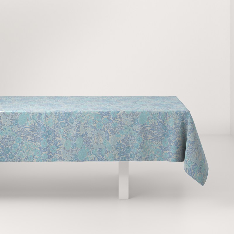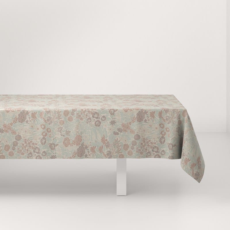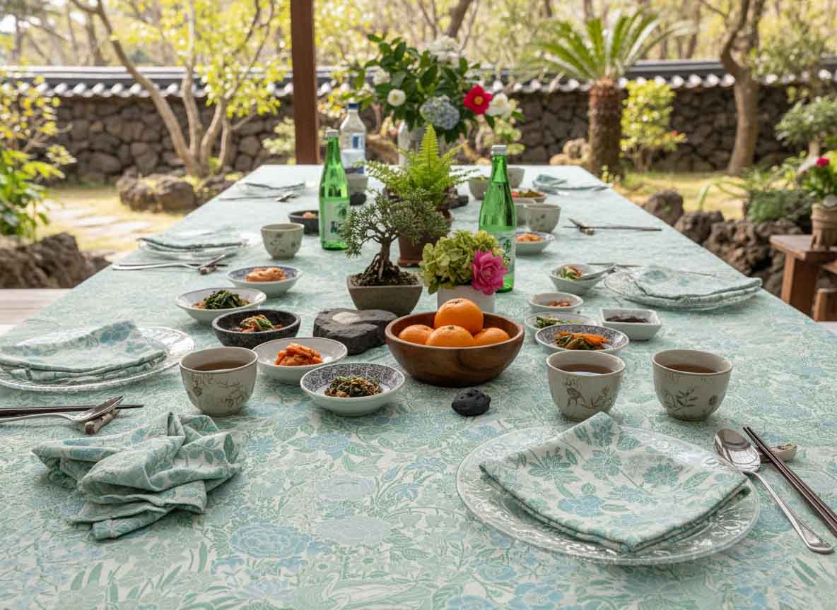 Jeju Gardens is available as a tablecloth and napkin in various sizes. The fabric is made of 100 percent European pure linen in a precise jacquard linen weave. The color palette comprises eleven shades and ranges from delicate pastel to intense hibiscus and cool glacier blue. Capri brings Mediterranean blue, while Opal conveys a shimmering turquoise. Amaranth comes in bright pink, Autumn Leaves in earthy brown tones, Harvest Gold as a warm yellow. Basalt delivers dark gray, Dark Sage a deep sage green, and Mystic Garden, the most complex color scheme, combines the nuances of a mysterious garden. Each colorway has been designed to showcase the floral diversity of the design – the overlay of magnolia, chrysanthemum, camellia, lotus and lily. The colors support the legibility of the individual flower motifs and allow the relief of the jacquard weave to stand out clearly. Jeju Gardens is a tablecloth for occasions where the table should not be characterized by geometric abstraction but by floral abundance – the four seasons as a timeless principle, the eternal cycle as a textile manifestation.