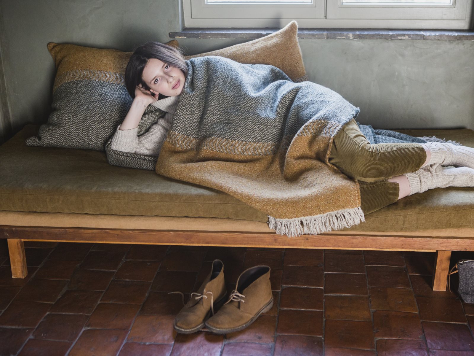 27% linen, 49% wool, 24% viscose, washed. Heavy quality at 830 grams per square metre, CO2-neutral production