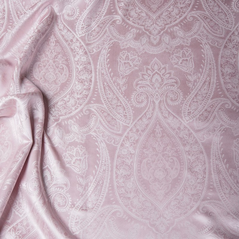 Paisley in a powder tone that is neither pink nor beige, but somewhere in between—subtle yet present. The teardrop shape of the paisley motif has travelled a long way: from Persia via Kashmir to Scotland, and finally to the looms of Plauen. Valeria showcases this ornamentation in fine detail, woven rather than printed, in silk rather than wool. A classic that does not need to be loud to be heard.