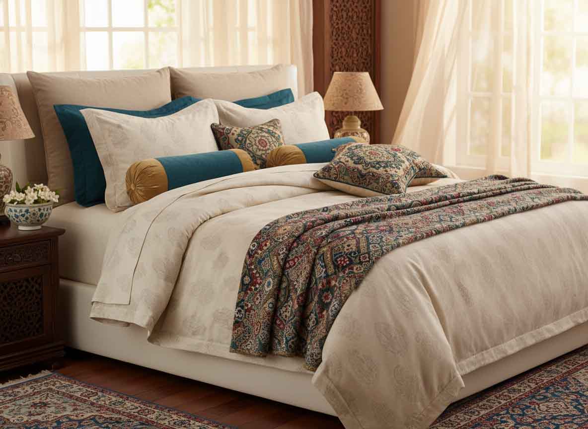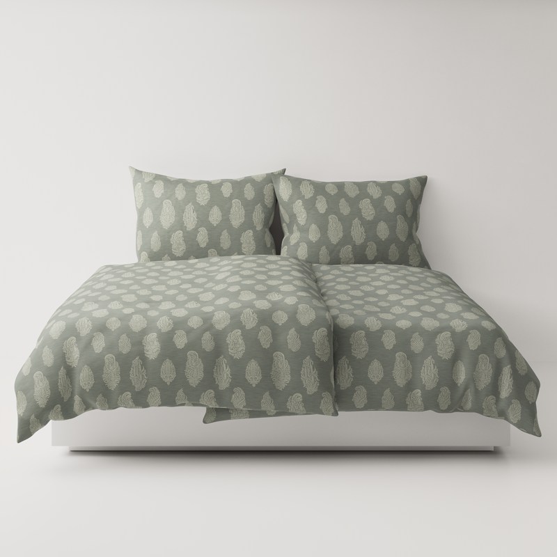 Half-linen is the result of textile intelligence: two fibers that combine their respective strengths to create a superior fabric. The warp of pure cotton provides elasticity and softness, while the weft of pure linen stands for strength and durability. This construction creates bed linen with remarkable properties: On warm days, the linen content has a cooling effect; on cool nights, the cotton retains warmth. The fabric regulates moisture naturally – it absorbs it generously and transports it away quickly without feeling damp. The antibacterial properties of linen fibers remain largely effective in half-linen, while cotton significantly reduces the characteristic linen creasing and simplifies care. The better dyeability of cotton enables the subtle shading of the Yara design, which gives each boteh motif its depth. More attractively priced than pure linen and more durable than pure cotton, half linen offers exceptional value for money.