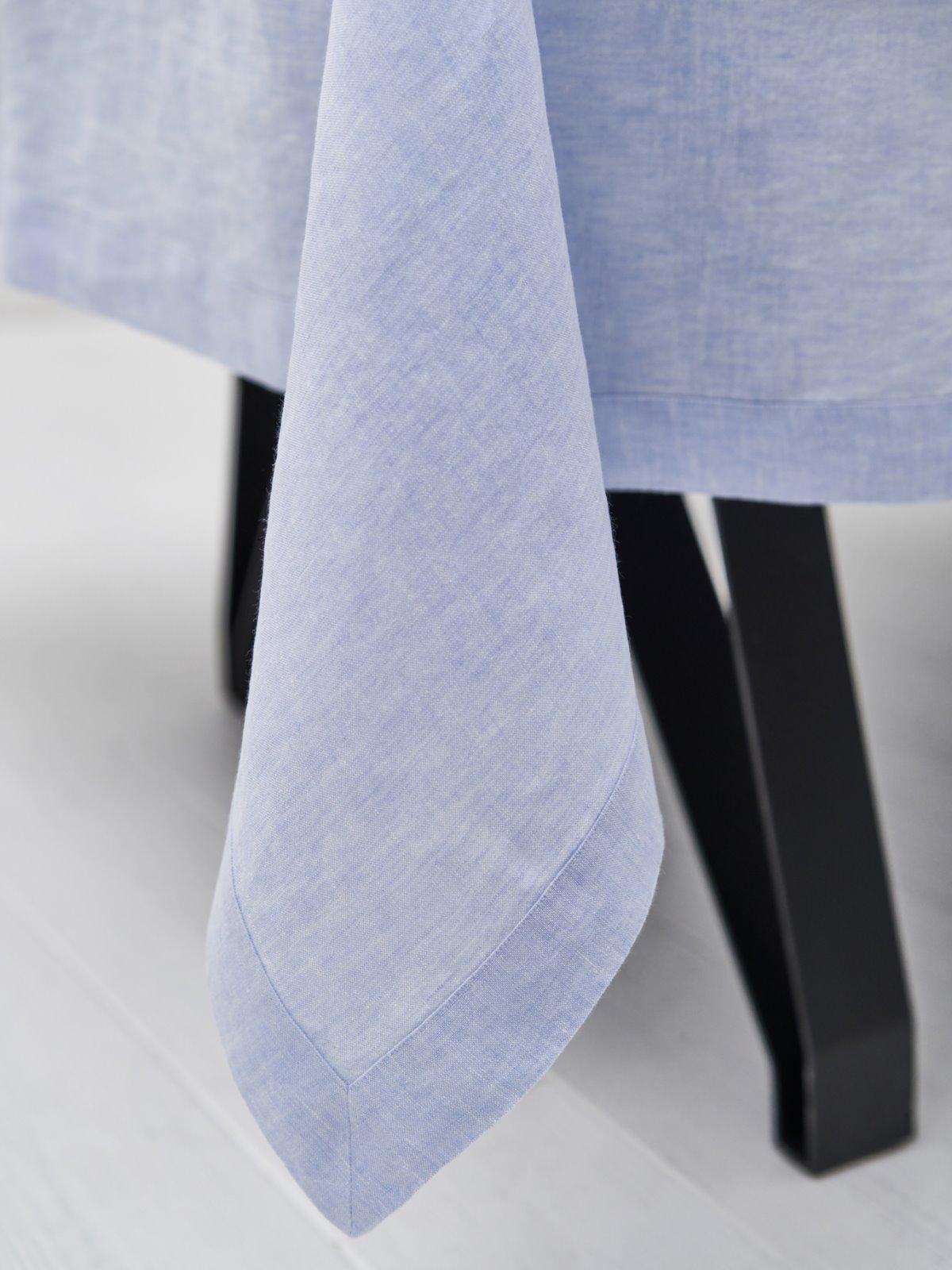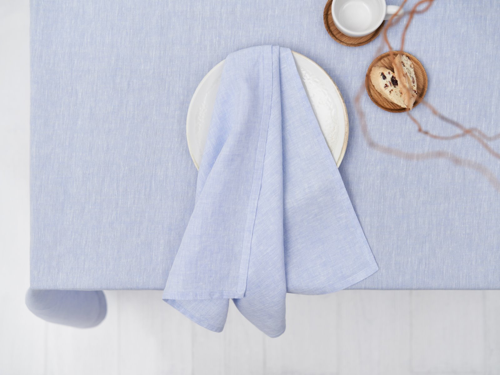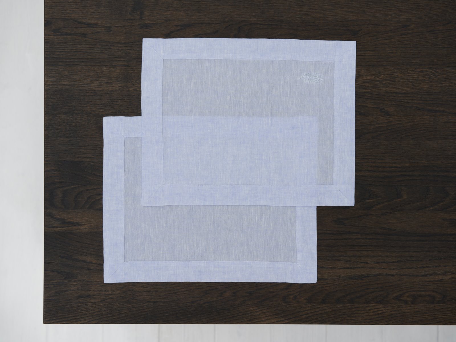 Celeste Leinen Tischgedeck von Geniksa. Aus einem Gemälde Monets scheint der hellblaue Pastellton entlehnt zu sein, der der Leinen- Tischgedeck Celeste von Geniksa ihre dezent schöne Farbe verleiht. Diese Tischdecke heitert jedes Esszimmer sofort auf und die berühmten Qualitäten der Flachsfaser sorgen für eine angenehme Atmosphäre. Jede Tischdecke von Geniksa ist mit einem eingestickten Logo, einem Kiefernzweig, versehen. 100 Prozent bestes gewaschenes Leinen.