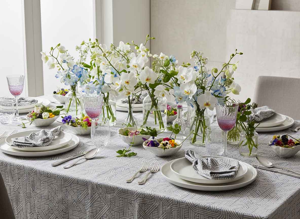 Confusion – die Verwirrung, das scheinbare Chaos, die komponierte Komplexität. Mit diesem Dessin verlässt Leitner Leinen die historischen Referenzen und betritt das Terrain zeitgenössischer Gestaltung. Der Wiener Designer Thomas Feichtner entwickelte für die Manufaktur ein monochromes Jacquardmuster, das ausschließlich aus Linien besteht: horizontal, vertikal, diagonal im 45-Grad-Winkel. Sie verflechten sich, überlagern sich, erzeugen Dichte und Leere – ein visuelles System, das sich der schnellen Entschlüsselung entzieht. Feichtner selbst bezeichnet seinen Entwurf als “ein auf den ersten Blick kausales Verwirrspiel mit Struktur und System”. Was wie Zufall wirkt, ist komponiert. Was wie Unordnung erscheint, folgt einer Logik. Das Muster referenziert die urbane Komplexität zeitgenössischer Metropolen: Überlagerungen, Schichtungen, die Gleichzeitigkeit verschiedener Rhythmen. Wer Confusion auf die Tafel bringt, inszeniert keine historische Reminiszenz, sondern bekennt sich zur Gegenwart. Die Tafel wird zum Ort zeitgenössischer Ästhetik, an dem sich Tradition und Moderne produktiv begegnen.