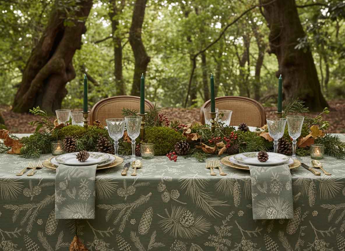 Foresta ist als Tischtuch und Serviette in verschiedenen Größen erhältlich. Das Gewebe besteht zu 100 Prozent aus europäischem Reinleinen in strukturierter Jacquard-Leinenbindung. Die Farbpalette umfasst acht Farbtöne und reicht vom warmen Copal über die kraftvollen Rottöne Karmesin, Rostrot und Rubin bis zum tiefen Grün von Tanne. Die erdigen Töne Leinen und Terra vermitteln warme Zurückhaltung, während Anthrazit als dunkelster Ton der Serie waldhafte Tiefe einbringt. Jede Farbstellung wurde so konzipiert, dass die vertikale Struktur des Dessins zur Geltung kommt – das Muster wirkt nicht durch Ornament, sondern durch organische Rhythmik. Foresta ist ein Tischtuch für Anlässe, bei denen die Tafel nicht durch kulturelle Referenzen, sondern durch Naturprinzipien wirken soll – gewachsene Ordnung statt konstruierter Symmetrie.