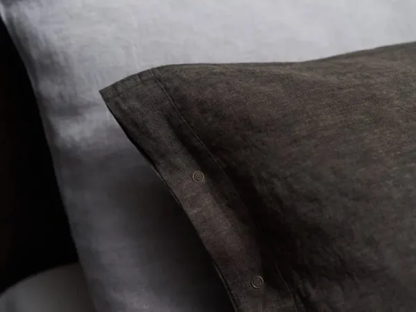 Jungle Snaps Leinen Bettwäsche von Geniksa. Leinen-Bettwäsche von Geniksa in einem dunklen, warmen Braun. Eine Bettwäsche, die durch ihre hohe Qualität und Verarbeitung überzeugt. Zugleich eine Bettwäsche, die so viel Gemütlichkeit ausstrahlt, das sich in ihr etwaige Alltagssorgen schnell bei schönen Träumen vergessen lassen. Nur echt mit dem eingestickten Logo, dem Kiefernzweig von Geniksa. Hier in der praktischen Variante mit unsichtbaren Druckknöpfen. Eine Seite des Kopfkissens ist mit dem Monogramm des Pinienzweigs bestickt. 100 Prozent bestes gewaschenes Leinen.