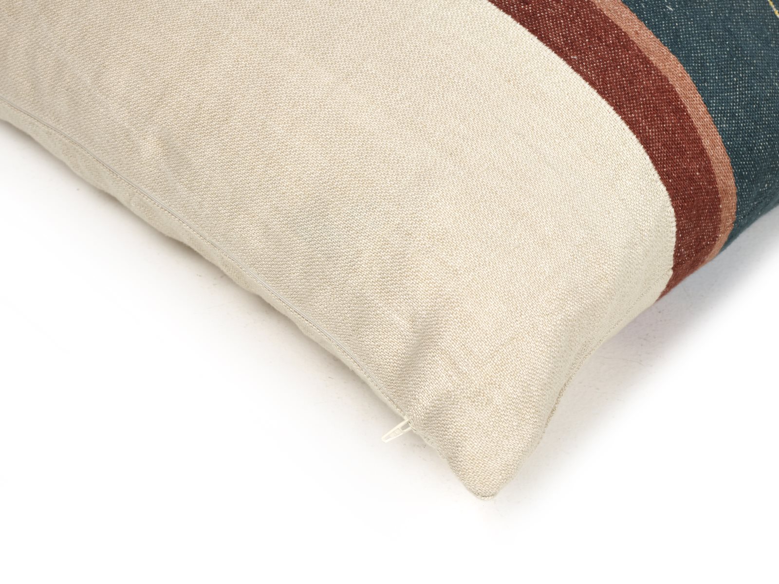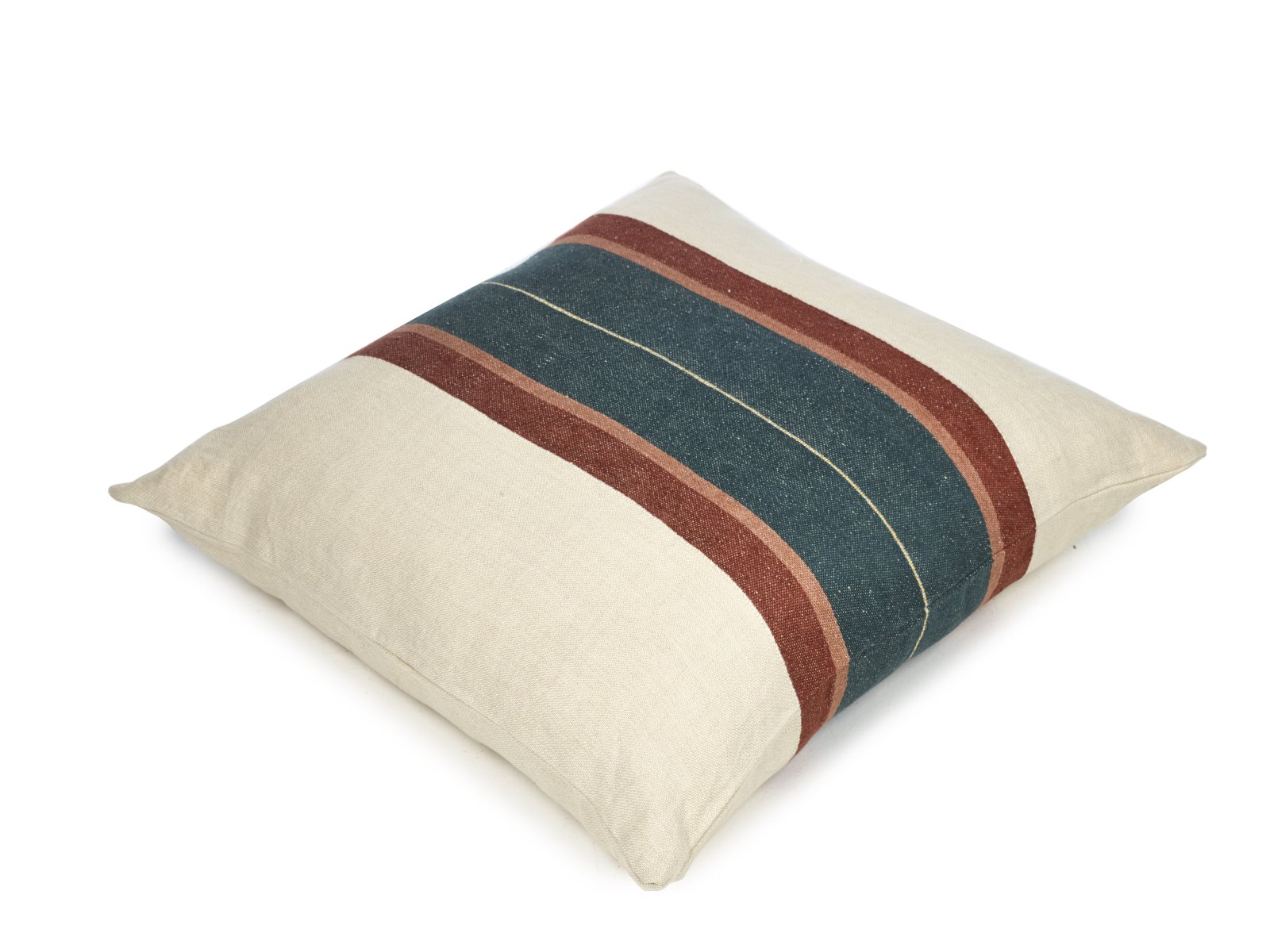 “Diese Tagesdecke wurde passend zur Kollektion “Swimmers Stripe” entworfen, lässt sich aber auch fabelhaft mit “Workshop Stripe”, “Canal Stripe” und den einfarbigen Stoffen der “Madison”-Kollektion kombinieren. Es ist eine mittelschwere Materialkonstruktion mit Mittelnaht und einem Fransenabschluss oben und unten. Zum Kopf- und Fußende hin verlaufen zwei unterschiedliche Streifen über die gesamte Breite der Decke. Der breitere Streifen setzt sich aus tannengrünen, lederbraunen, altrosa und senffarbenen Komponenten zusammen. Der schmalere Streifen zeigt sich in den Farben Tannengrün, Altrosa und Bone”