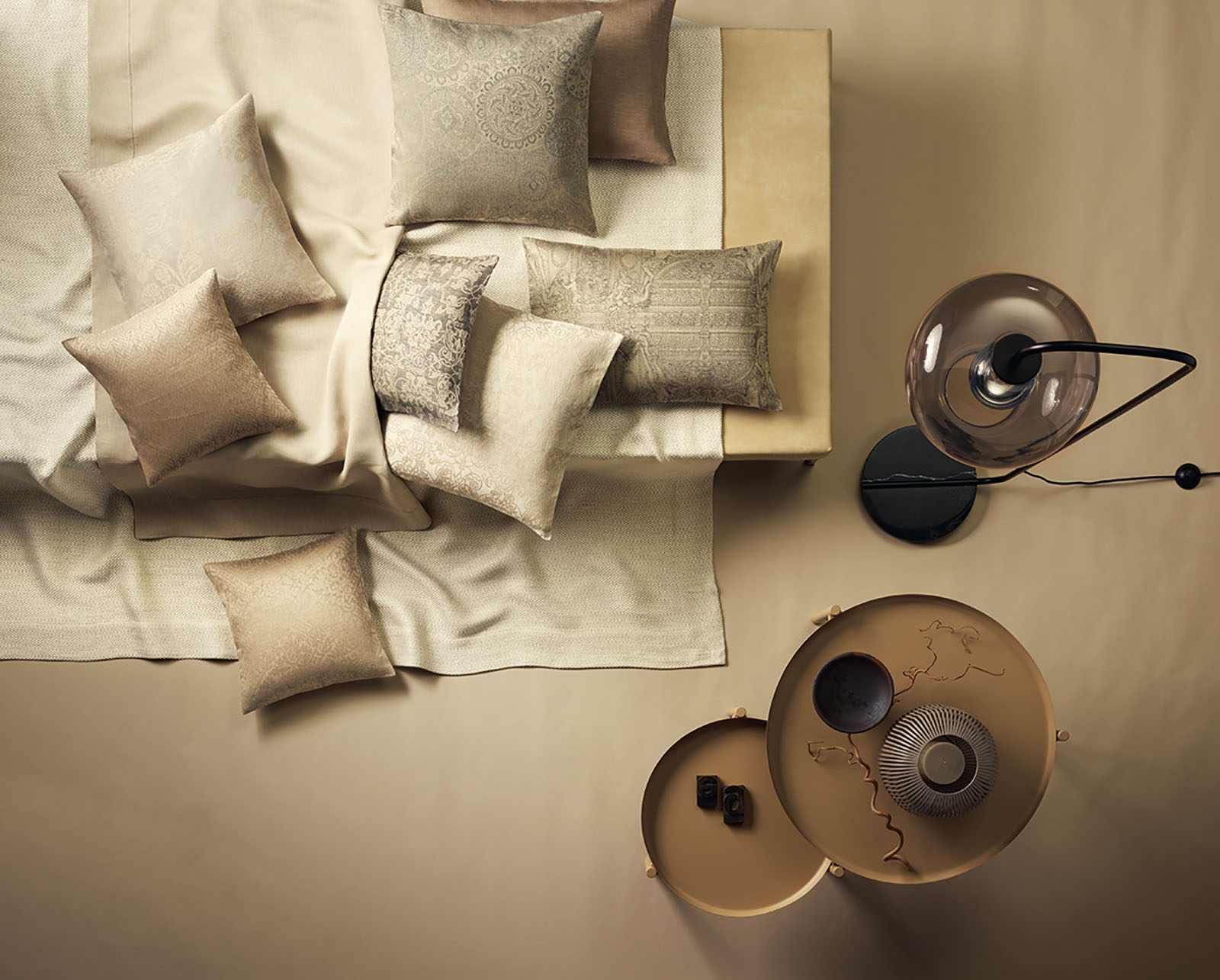 Seit 1853 webt die Leitner Manufaktur im österreichischen Vöcklabruck Leinen in jener Qualität, die sich nur durch handwerkliche Kontinuität erreichen lässt. Mariage entsteht in feiner Jacquard-Leinenbindung – ein Verfahren, bei dem das Muster nicht aufgedruckt, sondern direkt in die Gewebestruktur eingewoben wird. Jede Arabeske, jede Ranke ist nicht Auflage, sondern integraler Bestandteil des Gewebes. Die Jacquard-Technik, benannt nach ihrem Erfinder Joseph-Marie Jacquard (1752–1834), ermöglicht es, komplexe Musterverläufe zu realisieren, indem jeder einzelne Kettfaden individuell angehoben oder gesenkt wird. Das Ergebnis ist ein reliefartiges Gewebe, bei dem sich gemusterte und ungemusterte Flächen haptisch unterscheiden – ein subtiler Effekt, der sich beim Anfassen wie beim Betrachten entfaltet. Die Manufaktur in Vöcklabruck arbeitet nach wie vor mit mechanischen Webstühlen, die in ihrer Präzision modernen Maschinen überlegen sind, weil sie den für Leinen typischen, unregelmäßigen Fadenverlauf aufnehmen, statt ihn zu bekämpfen. So entstehen Gewebe von jener gleichmäßigen Unregelmäßigkeit, die maschinelle Perfektion niemals erreichen kann.