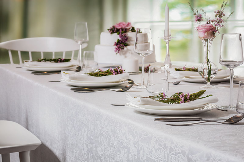 Mariage ist als Tischtuch und Serviette erhältlich. Das Gewebe besteht zu 100 Prozent aus europäischem Reinleinen in Jacquard-Leinenbindung, ohne Beimischung von Baumwolle oder synthetischen Fasern. Die Farbpalette umfasst neun Farbtöne und reicht von klassischem Weiß über die pastellige Zartheit von Sakura und die kühle Zurückhaltung von Blue Fog und Arctic Blue bis zu den erdigen, warmen Nuancen von Leinen, Terra und Stone. Rostrot verleiht der Tafel südeuropäische Wärme, während Lago einen Akzent von mediterraner Frische setzt. Jede Farbstellung wurde so gewählt, dass sie sich sowohl mit weißem Porzellan als auch mit farbigem Steingut kombinieren lässt – das Dessin trägt die Inszenierung, ohne sich aufzudrängen.