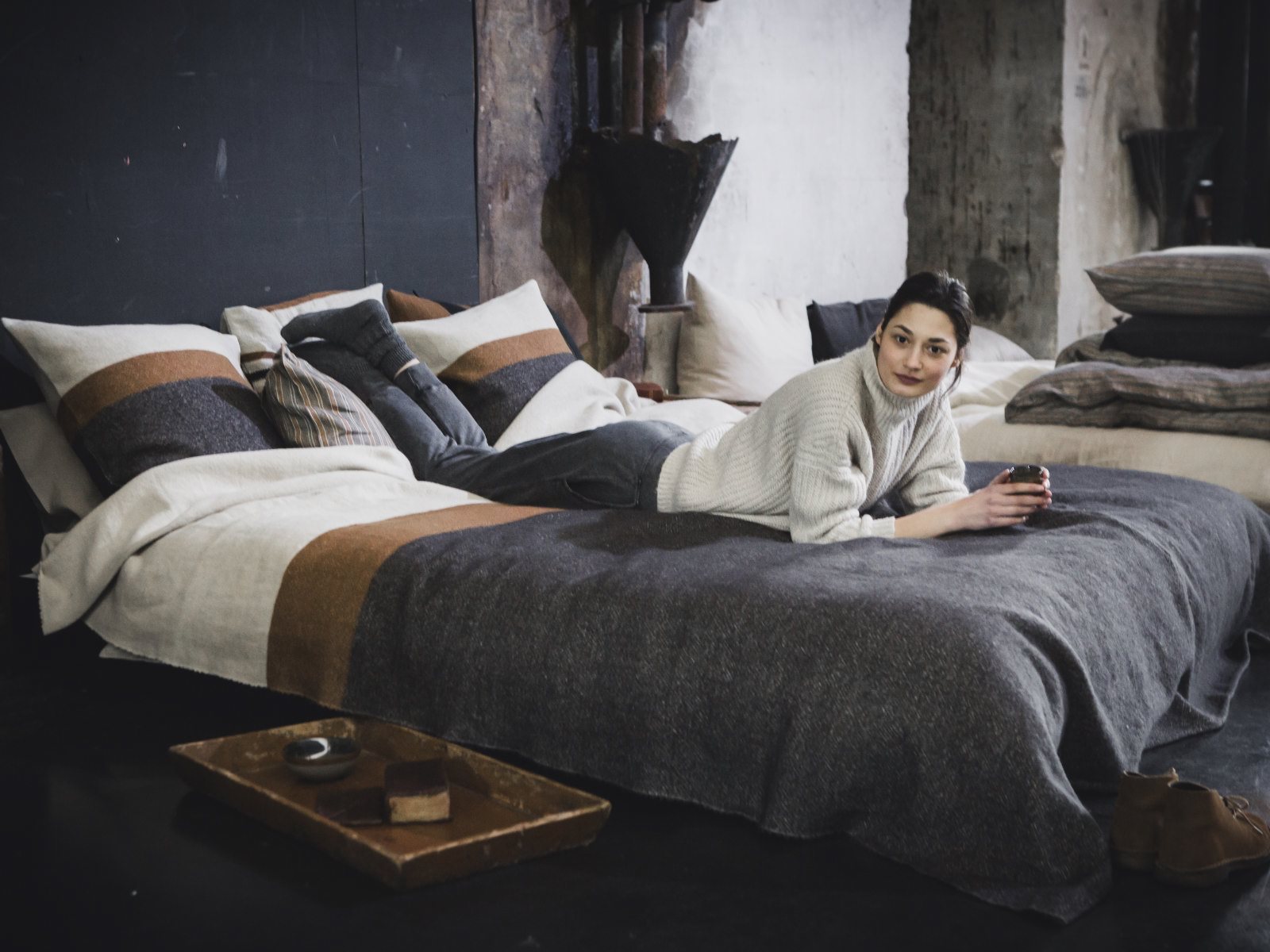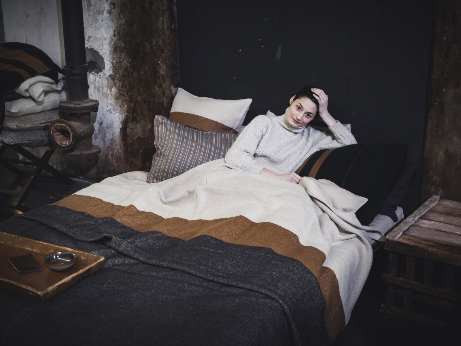 Nash Leinen-Wolle-Mix von Libeco ist aus einem alten Industriedesign in La Brugeoise entstanden … Das sagt die Designerin: „La Brugeoise gibt es seit 1818 und es behält seine originale Vorkriegspracht. La Brugeoise war ursprünglich das größte Eisenwerk Belgiens und später einer der wichtigsten internationalen Produzenten von Eisenbahnwaggons und Gleisen Material. Das Gelände wird nicht mehr als Produktionsstätte verwendet, aber Sie bekommen einen Eindruck dessen, was dieses Kleinod einmal war. Diese Kollektion dekorativer Leinen/Wolle Decken ist eine Weiterführung der beliebten Moroccan und Lincoln Stripe Kollektionen. Sie wurde nach dem Zweizylinder-Ottomotor Nash benannt, der in den frühen 1920er Jahren verwendet wurde.“