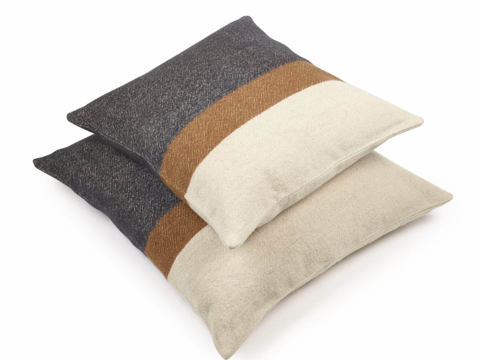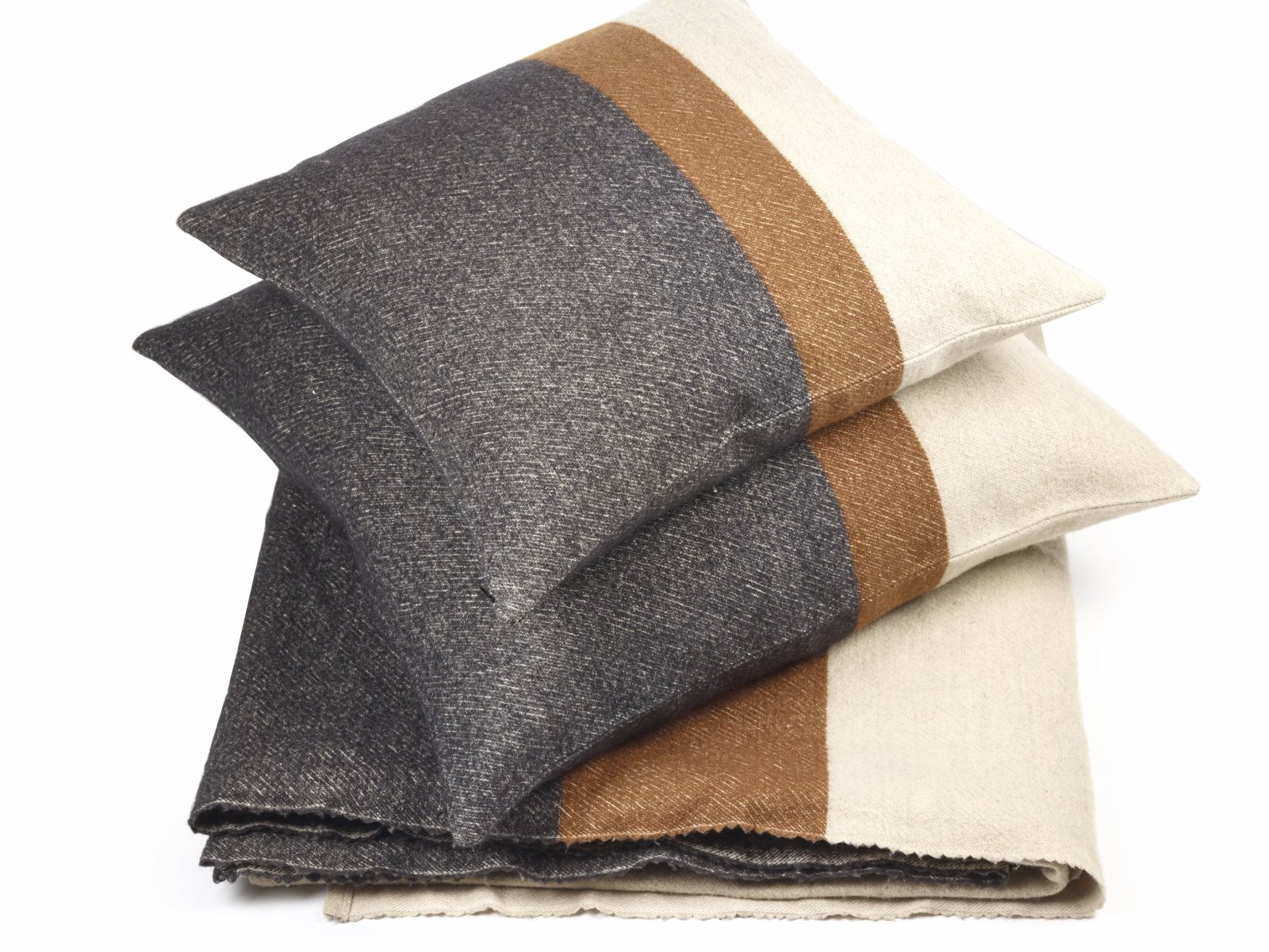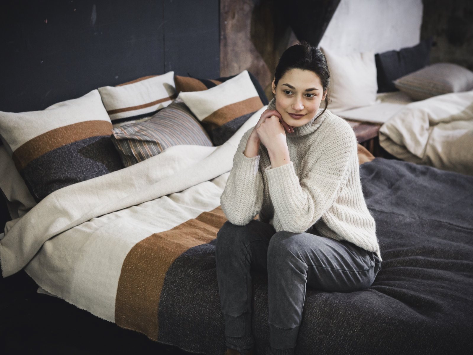 „Diese Kollektion kann mit Heritage, Santiago, Ingersoll, Oscar und Foundry kombiniert werden. Wie üblich bei den dekorativen Leinen/Wolldecken, gibt es einen Saum in der Mitte und in diesem Fall passen die Streifen zusammen. Die Arabica Streife bilden die unteren 2/3 der Decke und die Beeswax und Bone die oberen 1/3, mit dem Beeswax Rücklauf in der Mitte der Arabica und Bone Streifen.“