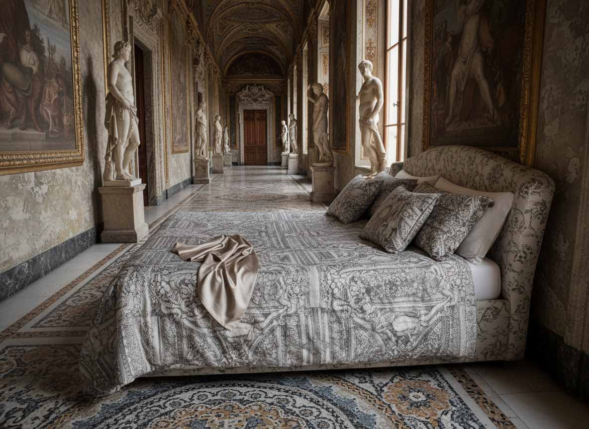 Palazzo – ein Name, der Paläste heraufbeschwört, venezianische Pracht und architektonische Meisterwerke am Canale Grande. Diese Bettwäsche ist gewebte Architektur, ein textiles Monument, das die Grandezza italienischer Paläste in Ihr Schlafzimmer trägt. Wo andere Dessins mit floralen Motiven arbeiten, setzt Palazzo auf architektonische Elemente: Säulen und Bögen, Kapitelle und Friese verschmelzen mit klassischer Ornamentik zu einem Gesamtkunstwerk von atemberaubender Detailfülle. Ranken winden sich um imaginäre Säulen, Arabesken rahmen mythologische Götterbilder, symmetrisch komponiert und doch reich verziert. Das Ergebnis erinnert an kostbare Wandteppiche aus der Zeit der Dogen, an kerzenbeschienene Salons mit Blick auf venezianische Kanäle. Die neun ausdrucksstarken Farbtöne – von elegantem Weiß über zartes Sakura bis zu dramatischem Anthrazit – erlauben individuelle Interpretationen: historisierend in gedämpften Grautönen oder selbstbewusst in leuchtenden Farben.