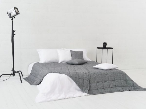 Scotia Leinen Tagesdecke von Geniksa. Eine gesteppte Tagesdecke, unter der es herrlich warm ist, wenn es draußen stürmt und schneit. Das eher dunkle Grau des eingefärbten Garns lässt den Stoff strukturiert erscheinen und die gesteppten Karos runden den Eindruck einer schweren Winterdecke ab, die aber an warmen Tagen wunderbar aufs Sofa passt. So wie es auch früher Usus war, besitzt jedes Bettwäscheteil von Geniksa ein eingesticktes Logo, einen Kiefernzweig. 100 Prozent bestes gewaschenes Leinen.