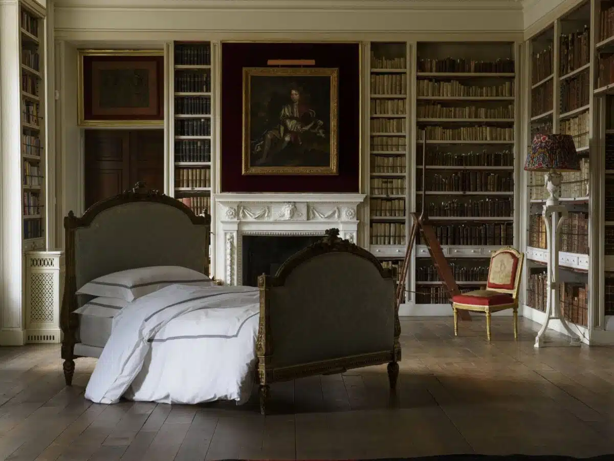 Peter Reed `Oxford style‘ Kissenbezüge mit einem dekorativen Flansch sind durchgehend mit traditionellen Gehrungsecken vernäht. Ihre Konstruktion erfordert die Montage von drei getrennten Stoffstücken und das geschickte Nähen. Das Endergebnis ist ein Flansch, der sich an den Ecken abstützt, wenn er auf das Bett gestellt wird, im Gegensatz zu der sonst üblichen Oxford-Konstruktion, die einen „Kaninchenohr“-Effekt erzeugen kann.