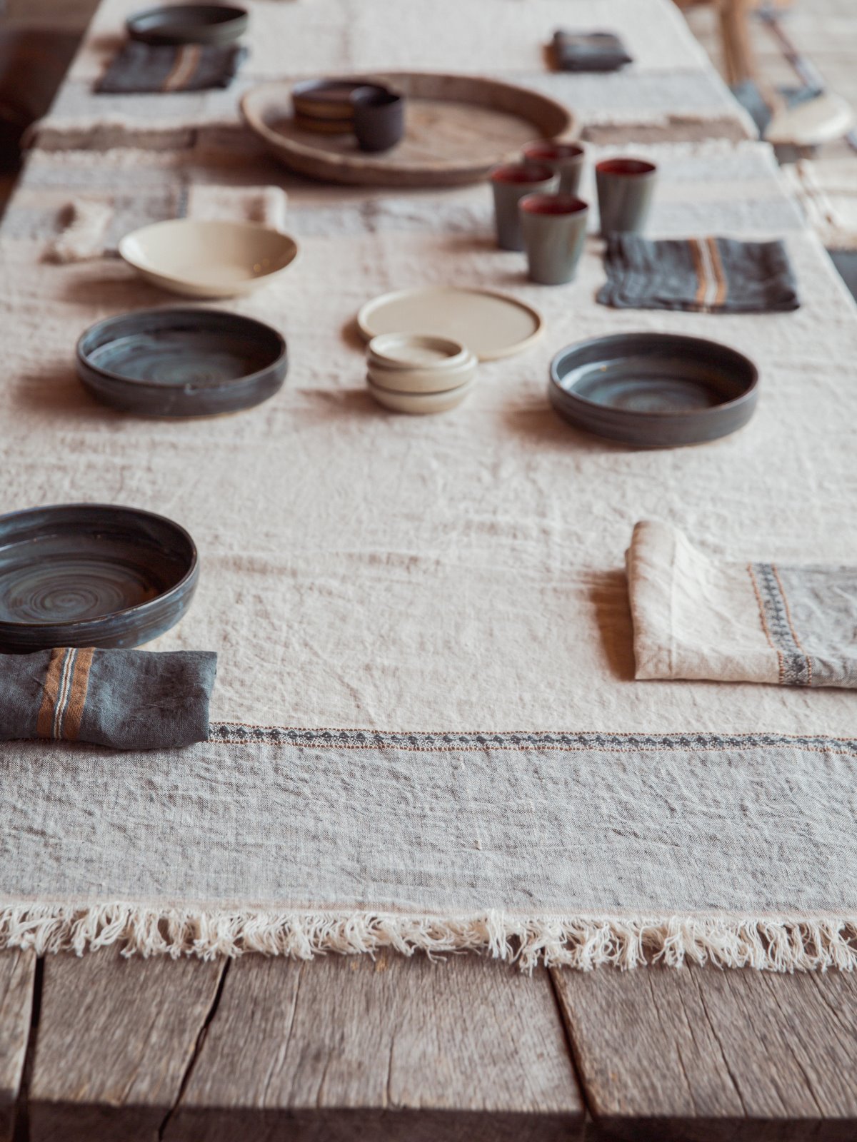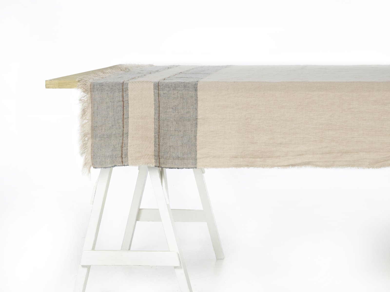The Belgian Table Throw Ioulida reines Leinen von Libeco. Das sagt die Designerin: „Wir präsentieren The Belgian Table Throw. Auf dieses neue Produkt sind wir ganz besonders stolz. Das Design ist von “The Belgian Towel” inspiriert, aber spezifisch als Tischwäsche konzipiert. Dank der strapazierfähigen Leinwandbindung lässt sich diese Tischdecke auch in der Maschine waschen. Sie bedeckt nicht den gesamten Tisch, so dass sowohl das Möbelstück als auch die wunderschöne Leinentischdecke perfekt zur Geltung kommen. Auf dem flachsfarbenen Untergrund befinden sich zu den Enden hin zwei unterschiedlich breite Streifen in Lederbraun, Blau und Senfgelb. Die gefransten Ränder an beiden Enden runden das Design ab.“