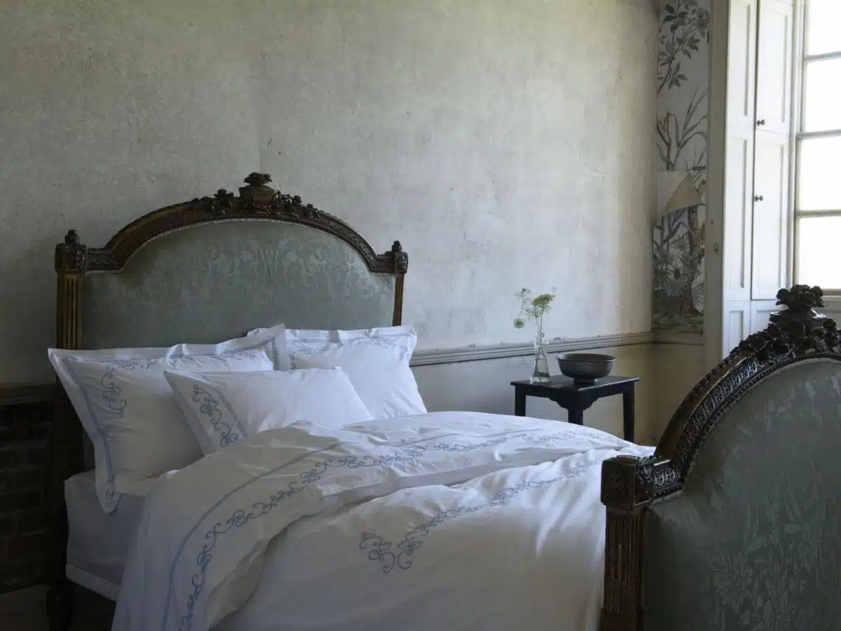 Peter Reed `Oxford style‘ Kissenbezüge mit einem dekorativen Flansch sind durchgehend mit traditionellen Gehrungsecken vernäht. Ihre Konstruktion erfordert die Montage von drei getrennten Stoffstücken und das geschickte Nähen. Das Endergebnis ist ein Flansch, der sich an den Ecken abstützt, wenn er auf das Bett gestellt wird, im Gegensatz zu der sonst üblichen Oxford-Konstruktion, die einen „Kaninchenohr“-Effekt erzeugen kann.
